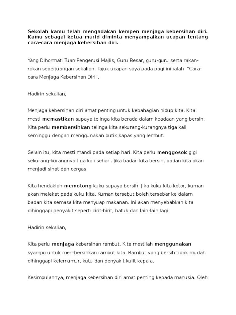 Contoh karangan kepentingan menjaga kebersihan diri. Contoh Karangan Cara Cara Menjaga Kebersihan Diri Spm. Banyak frasa menarik yang digunakan dalam karangan esei dan boleh dipelajari.